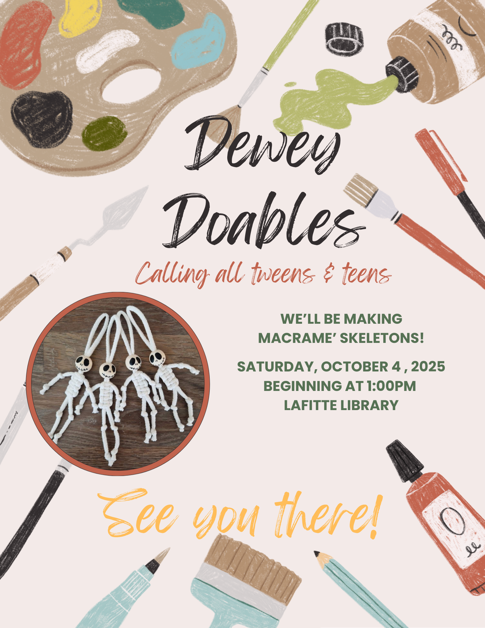 This event is in the "Tweens (Ages 8-11)" group This event is in the "Teens (Ages 12-18)" group Dewey Doables Saturday, October 4, 2025 at 1:00pm - 2:00pm Lafitte Library Program Type: Arts & Crafts Age Group: Tweens (Ages 8-11), Teens (Ages 12-18) View Details This event is in the "Tweens (Ages 8-11)" group This event is in the "Teens (Ages 12-18)" group Oct 4 2025 Sat Dewey Doables 1:00pm–2:00pm Lafitte Library Library: Lafitte Library Age Group: Tweens (Ages 8-11), Teens (Ages 12-18) Program Type: Arts & Crafts Event Details: