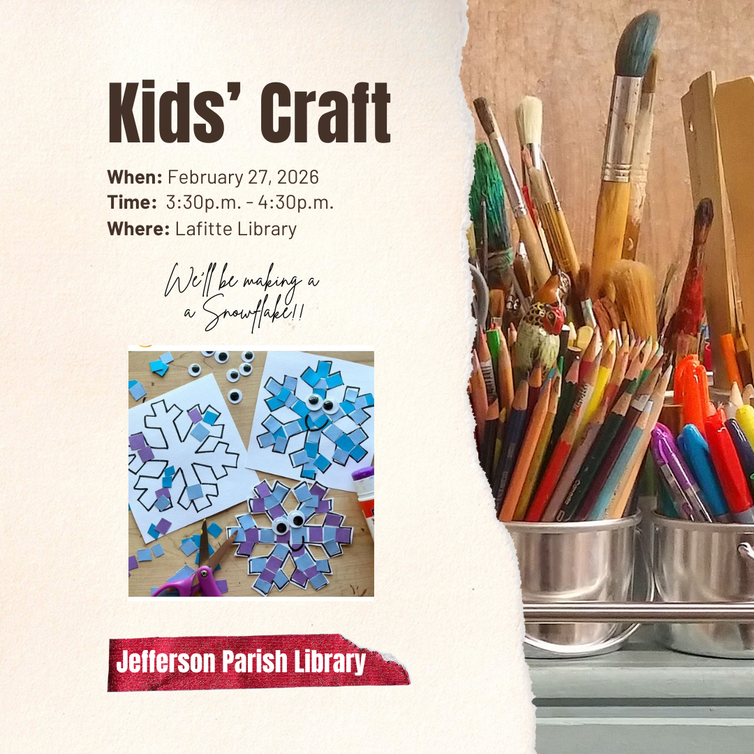 Craft projects for kids 3+ while supplies last! Visit the Children's Department. Bringing a large group (10 or more children and adults)? Please call (504) 364-3664 to speak with a librarian regarding reservation spots and attendance limits.